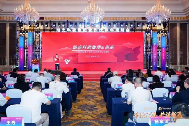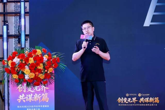 京东特邀嘉宾则展示了2025年科密与歌派在京东平台的经营数据。他表示,在多版块业务中,京东将与阳光科密深度合作,为阳光科密提供全方位解决方案、多矩阵支持,打通全链路、赋能合作伙伴“增值”,为代理商开辟全新增量通道。